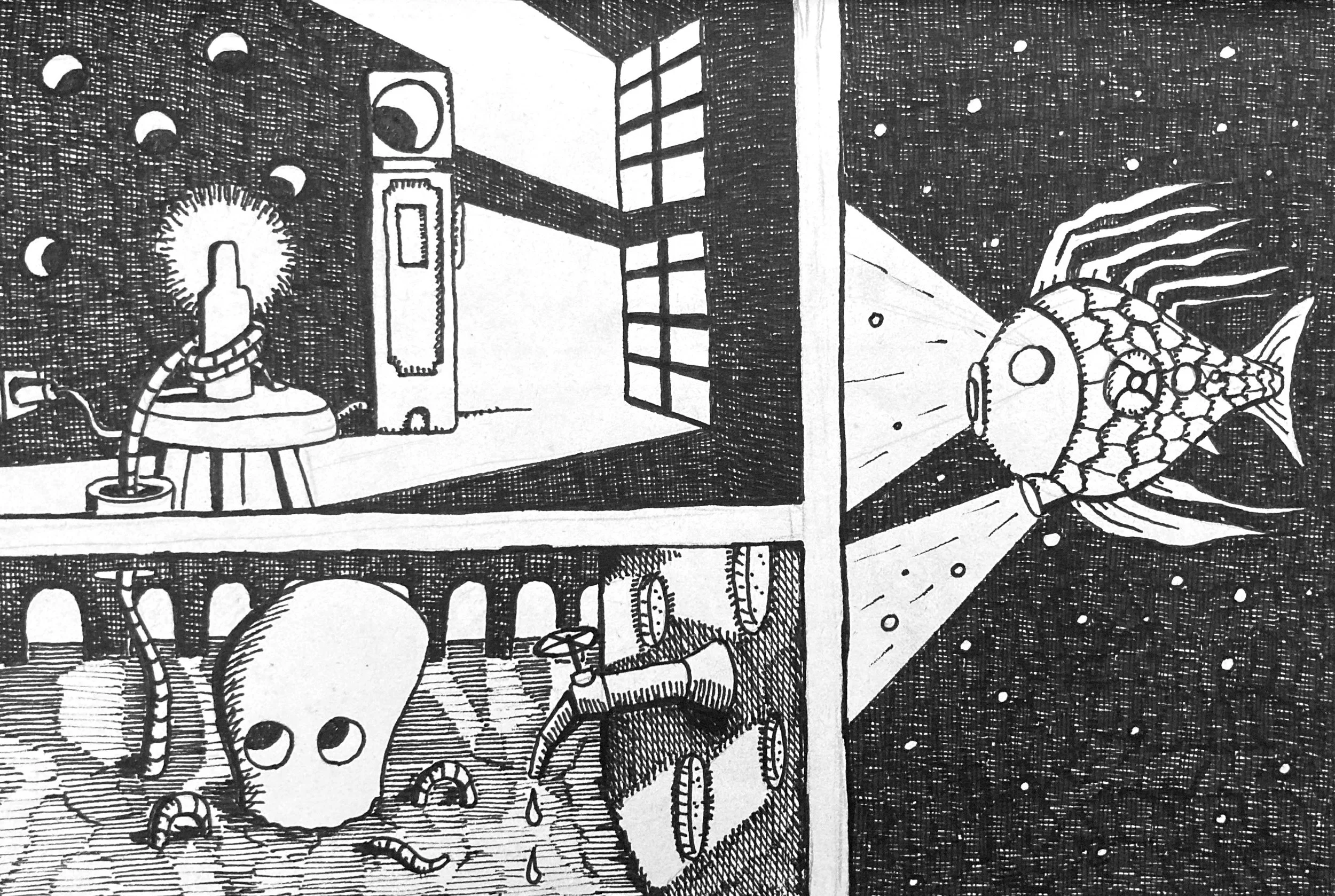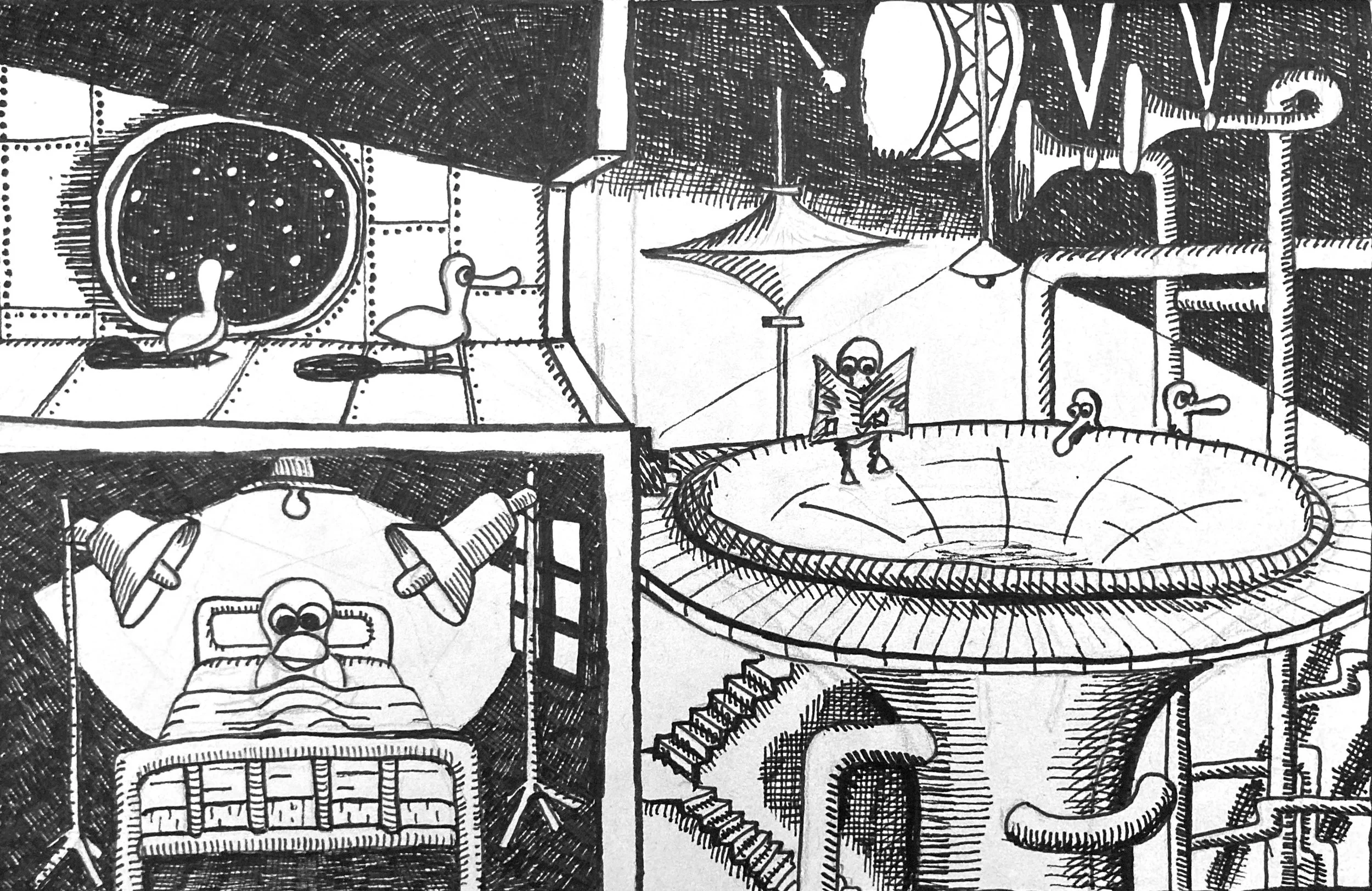 Le dessin est intervenu discrètement, c’est en lisant la BD Baku de Grégoire Carlé, que j’avais rencontré par la musique au tout début de mes études de son en 2010, j’y ai découvert le dessin par hachures et j’ai été impressionné par le contraste entre les moyens techniques dérisoires (feutre et papier) et la force du résultat avec toutes les possibilités offertes. A l’époque, Grégoire collaborait avec l’Association et j’ai pu rencontrer Jean-Christophe Menu un soir et la discussion qui a suivi m’a amené lentement à un déclic, l’idée de dessiner est resté dans ma tête jusqu’au moment, en 2012, où la sécheresse musicale était au plus fort, je me suis décidé à acheter le matériel minimal nécessaire et à appliquer la méthode que j’avais expérimenté en musique vers le dessin.